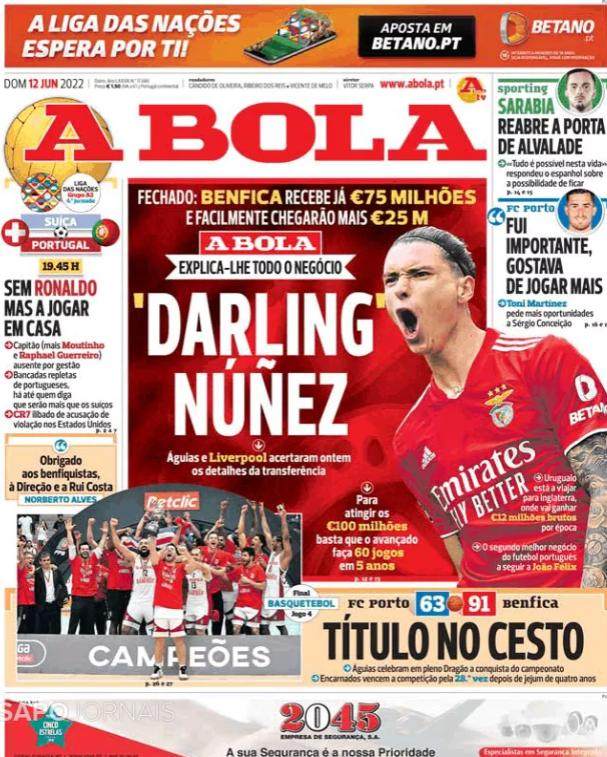 6月12日一期的葡萄牙《球报》和《纪录报》,达尔文·努涅斯转会利物浦一事都上了封面。两家报纸都说,这桩转会已经于6月11日谈妥。